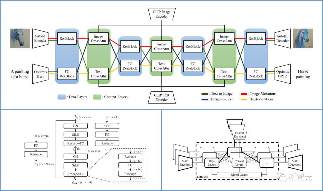 研究人员基于Versatile Diffusion,进一步提出了一个通用的多流多模态框架,其中包括VAE、上下文编码器和包含三层(即全局、数据和语境层)的diffuser。