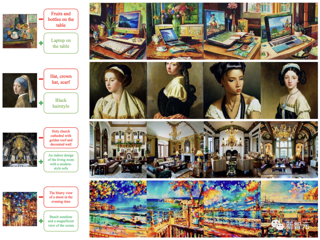 在下图的展示中,输入的图像首先被翻译成prompt,然后用减法(红框)和加法(绿框)对prompt进行编辑。最后,编辑后的prompt被翻译成图像。