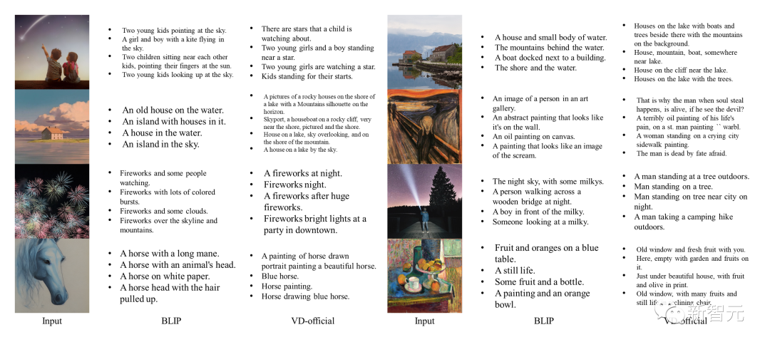 此外,由VD生成的图像标注还包含了一些创造性的词语。相比起来,BLIP的生成就很短,缺乏对细节的描述。