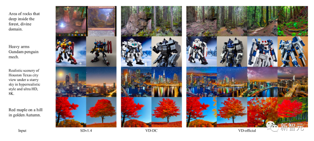 同时,作者还对不同的VD模型进行了定性比较,其中VDDC和VD-official用于文本到图像,所有三个模型用于图像变体。