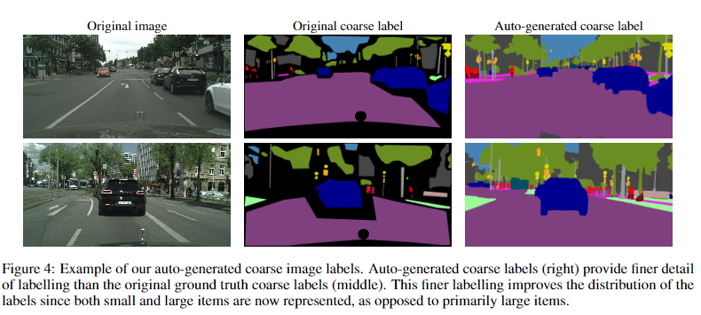 受最近关于图像分类任务自动标记工作的启发,本文采用了一种用于Cityscapes的自动标记策略来增加有效数据集大小和标签质量。在Cityscapes中,有2万张带有粗糙标签的图片,以及3500张带有精细标签的图片。粗图像的标签质量非常适中,包含大量未标记的像素,如图所示。通过使用自动标签方法,可以提高标签的质量,这反过来又有助于模型IOU。