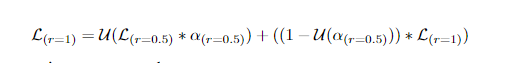 在训练过程中,给定的输入图像按因子r进行缩放,其中r= 0.5表示向下采样按因子2进行,r= 2.0表示向上采样按因子2进行,r= 1表示不进行操作。对于训练过程,选择r= 0.5和r= 1.0。因此,对于两种尺度的训练和推断,以U为双线性上采样操作,将∗和+分别作为像素级的乘法和加法,方程可以形式化为: