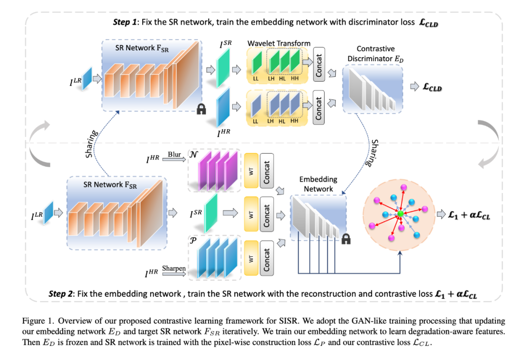 本文调查研究了 SISR 的对比学习并提出一种有效的 SISR 对比学习框架,可同步生成多个正负样本。最近的研究显示现有深度学习方法得到的超分结果趋于平滑,视觉上不自然不合理。基于这些发现和对困难负样本的挖掘研究,文章通过将轻微模糊添加于 gt 以生成困难负样本以及简单锐化以生成富含信息的有效正样本。从而为超分图像获得正负样本对。