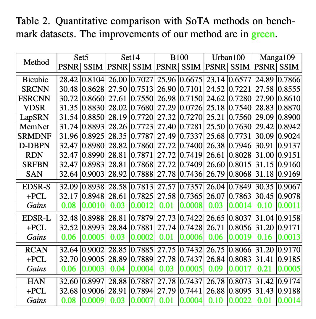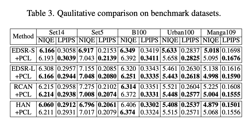 3. 额外实验证明本文的方法(PCL-SISR)表现在定量与定性方面均优于代表性的 SISR 方法。