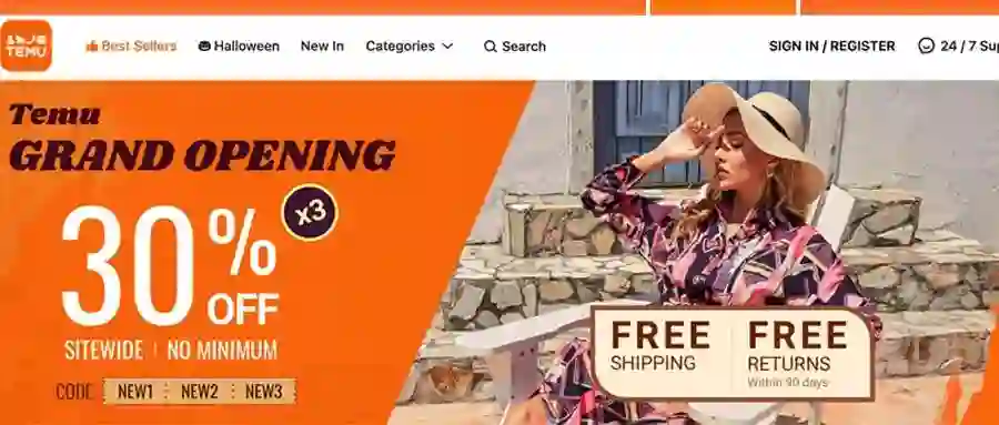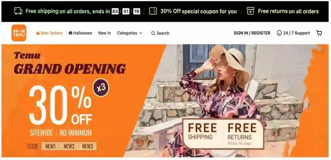 在邮寄时间跟Shein基本持平(1-2周)的情况下,Temu的目前所有商品无门槛免邮费,发起开业大酬宾送给所有人7折优惠券,同时允许90天内无条件退货。