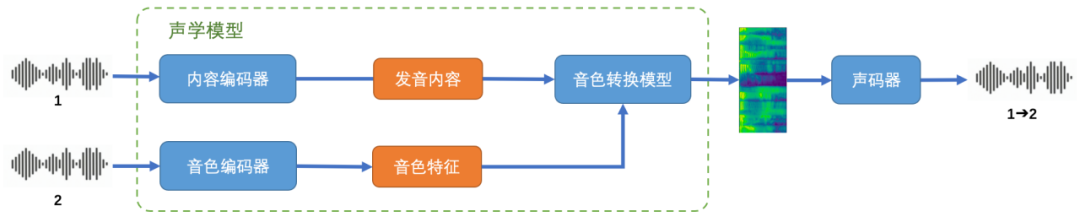 同基于深度学习的语音合成一样,声音转换的模型也由声学模型(acoustic model)和声码器(vocoder)组成。声学模型通过内容编码器从输入音频中提取出发音内容序列,并通过音色编码器从参考音频中提取出音色特征,最后通过声音转换模型生成带有输入音频内容和参考音频音色的频谱;声码器负责将声学模型生成的频谱还原为能够被设备直接播放的音频采样点: