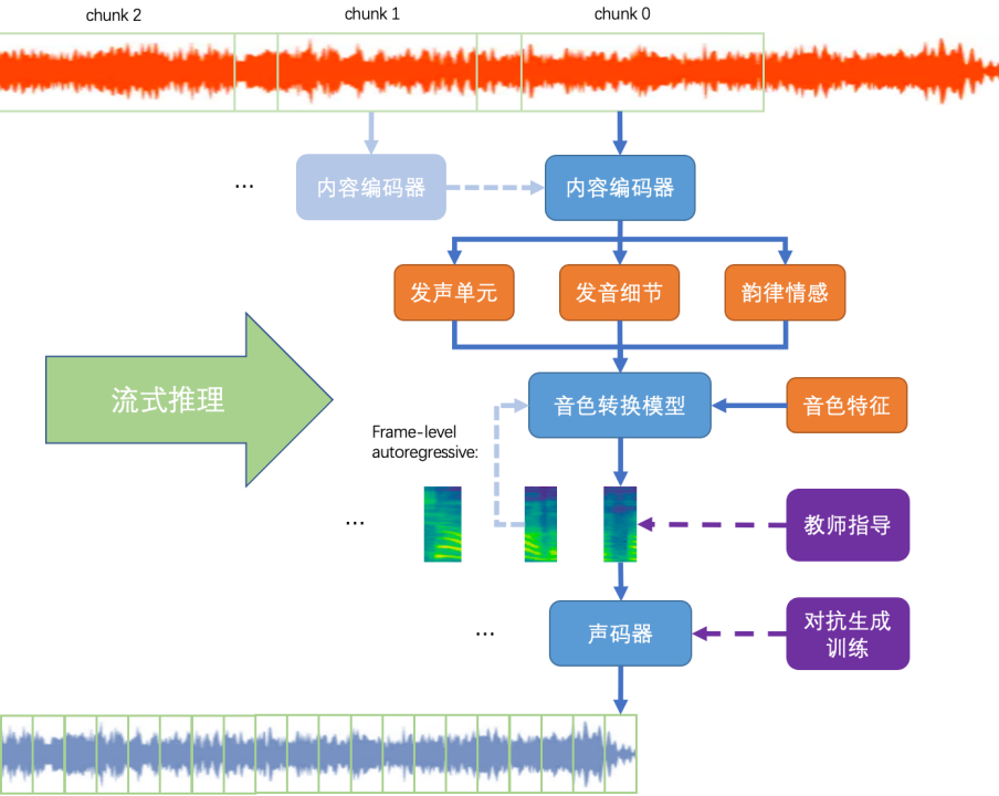 为了达到上述要求,研究人员对模型进行了一系列改进,使得模型的首包延时压缩到 250ms 左右。实时声音转换的整体框架如下:
