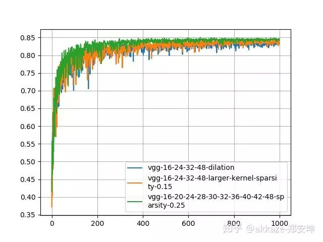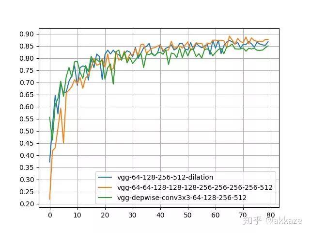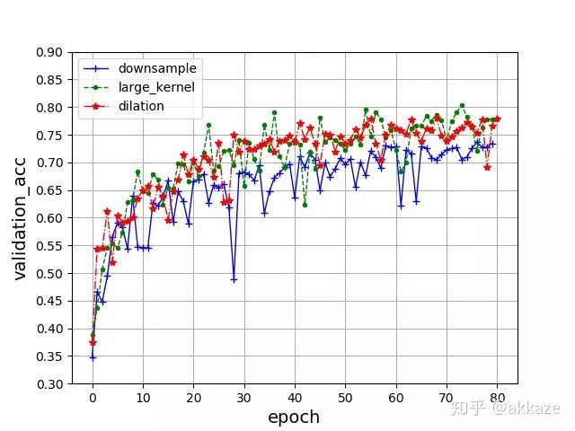 从另一种思路出发,为了扩大卷积的感受野,也可以直接增加卷积的kernel_size,与上面对比,保持dilationrate为1不变,同时逐层增大卷积的kernel_size,分别为3,5,7,9,训练80个epoch后得到如下准确率曲线,