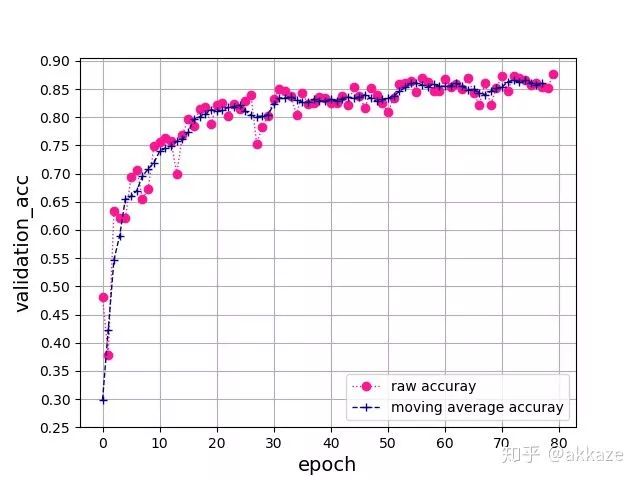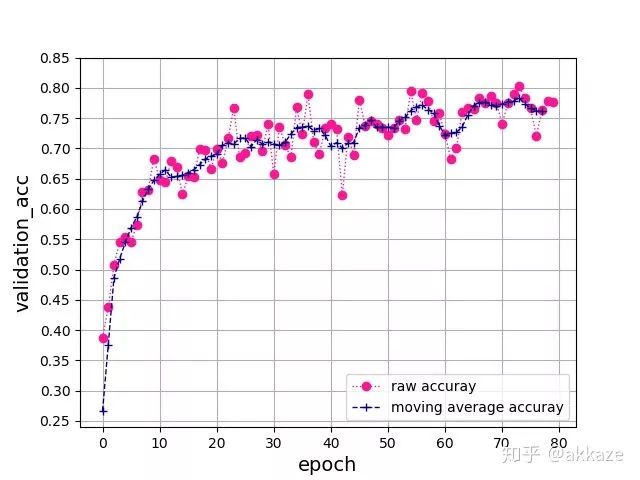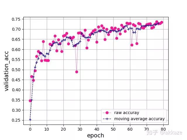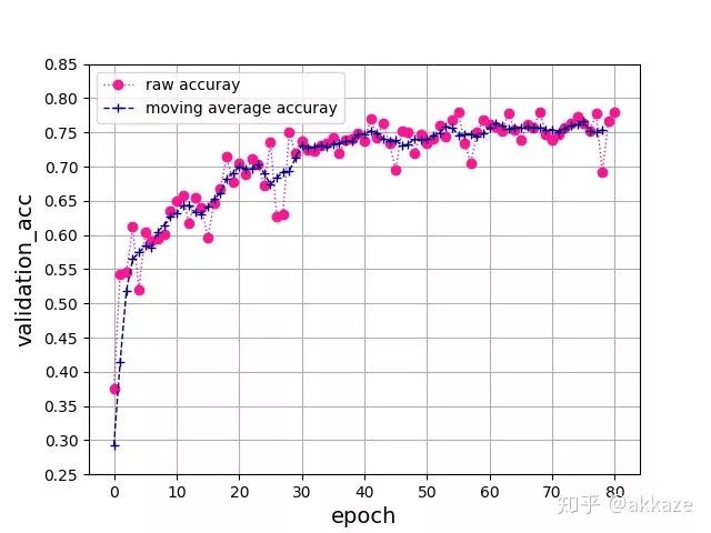 为了验证这种想法的通用性,使用resnet18结构的网络,并在原本需要下采样的卷积层使用dilation_rate不断增大的空洞卷积替代。训练80个epoch后,最终得到的准确率曲线如下 所示,