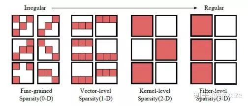 我们常见的其实是通道维度的稀疏化,这相当于减少通道数,也最容易加速,但是更有意义的稀疏化,我认为是卷积核内部的稀疏化,如下图所示,