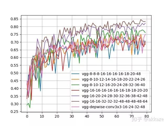 为了获得和上面四层卷积网络相同的感受野,我设计了一个十层的只有3x3卷积的网络,每层之间依然有非线性。因为层数多了很多,为了确定中间层的通道数,我做了几组实验。同时,为了不极大增加参数量,我又在卷积中间插入depthwise卷积,这样保持对应感受野上的通道数不变,而参数量不至于增加很多。训练结果,