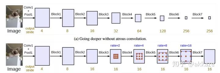 类似的想法最早出现在deeplab的相关论文Rethinking Atrous Convolution for Semantic Image Segmentation中,这篇文章中,空洞卷积主要是通过移除网络最后几层的降采样操作以及对应的滤波器核的上采样操作,来提取更紧凑的特征,并且不增加新的额外学习参数。