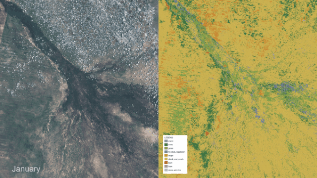 另外,还能用同一个地方的不同时间的地貌做对比 ,比如下面就是非洲一个三角洲河谷一年来的变化。