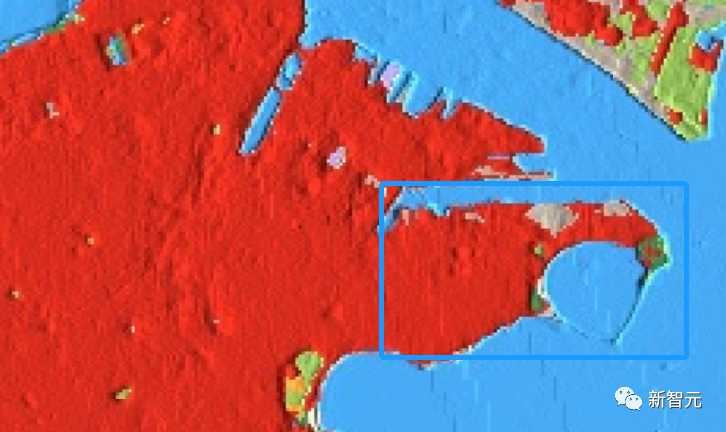 其中,蓝色表示水,深绿色表示树木,浅绿色表示草,浅紫色表示植被被淹没,金黄色表示农作物,浅黄色表示灌木,红色表示建筑,灰色表示裸露的荒地,紫色表示冰雪。