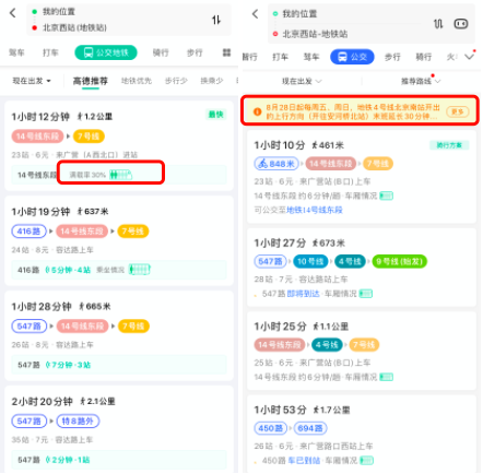 通过简单对比发现,对于同样的起点和终点,高德和百度地图推荐的前几种乘车路线是不太一样的。另外,在提供的信息细节上也不同:百度会给出最新的道路信息和骑行建议,而高德则更突出对要乘坐车辆的时间、满载率等信息。