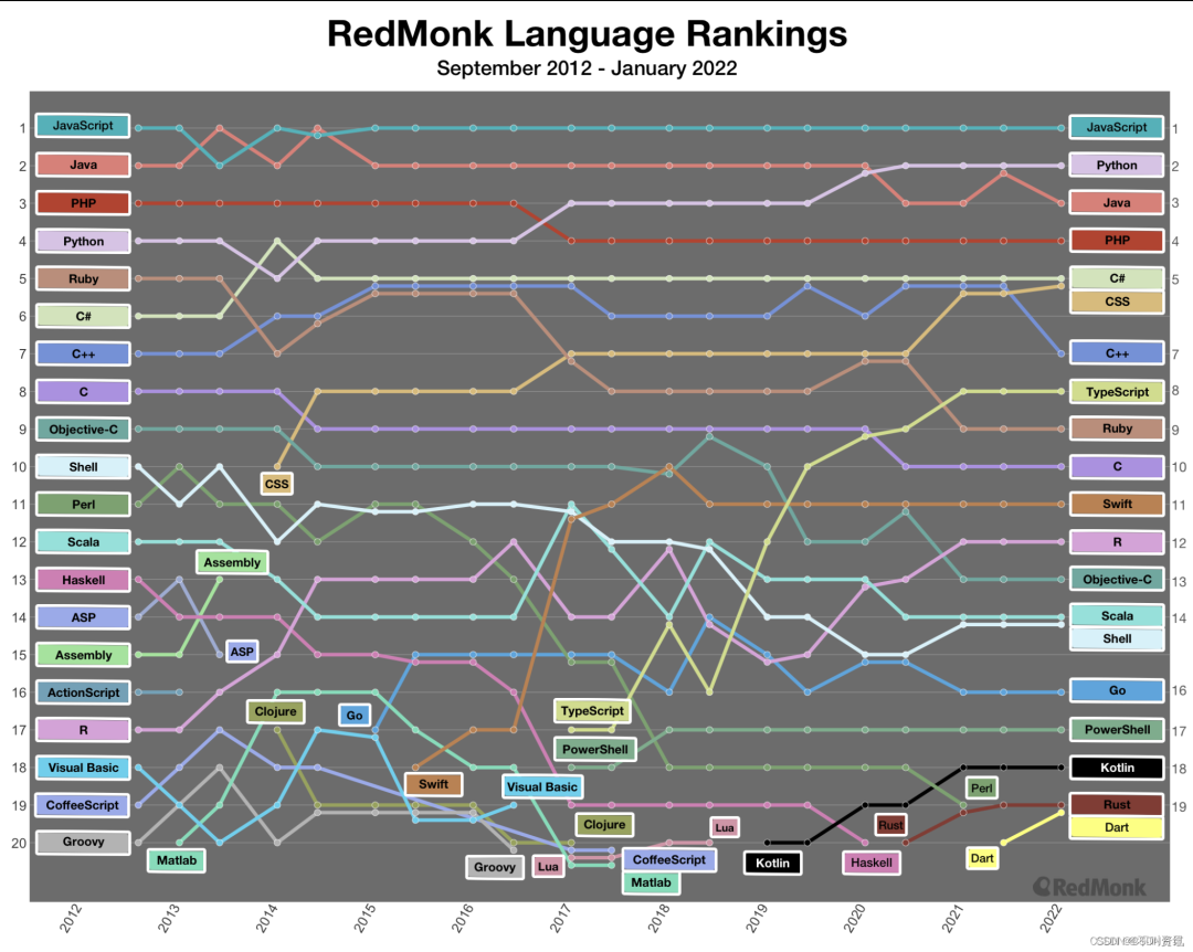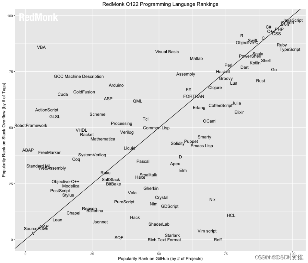 2022年Q1即将结束,在该季度编程语言发生了哪些变化?在GitHub和Stack Overflow上,什么语言的讨论度最高?知名软件行业分析公司RedMonk对 GitHub Archive和Stack Overflow数据工具进行分析后,发布了2022年Q1 编程语言排名。
