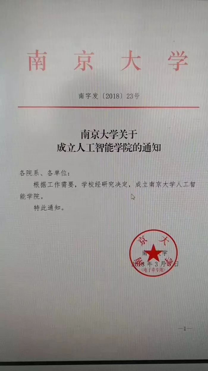 南京大学南字发【2018】23号文件显示,根据工作需要,学校经研究决定,成立南京大学人工智能学院。