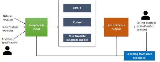 图二:所有供大型语言模型(包括 GPT-3、Codex 等)的输入都将经过预处理。如有必要,后处理输出还将被返回至最终用户进行验证和编辑。学习结果则被反馈至预处理和后处理机制当中,用以进一步改进 Jigsaw 的修正能力。