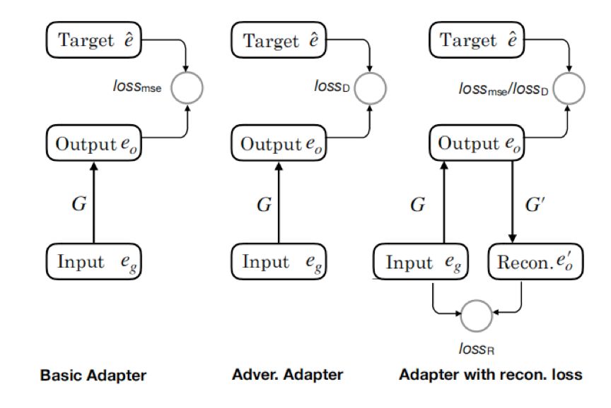 2、提出了一种映射机制,称为表示适配器,或者简称为适配器,用以将学习到的表示合并到关系检测模型中。从适配器非平凡训练的简单均方误差损失入手,提出将对抗性和重构目标结合起来,以改进训练过程。