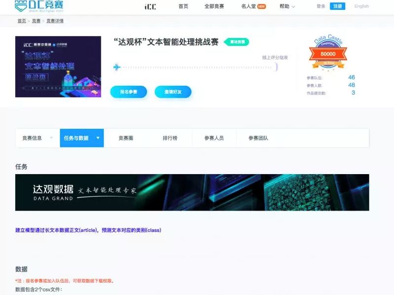 第二届「达观杯」将作为第二届智慧中国杯(ICC)7 月主题赛事之一在 DC 竞赛平台上线。本届「达观杯」以文本智能处理为主题。主办方达观数据也为参赛者筹备了围绕赛事展开的四场干货直播,值得期待!