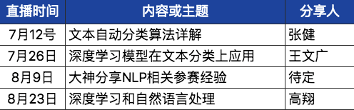 本次比赛主办方达观数据为大家精心筹备了 4 次关于赛事相关的技术直播,希望大家在看完直播后在 NLP 的学习路上会上一个新的台阶