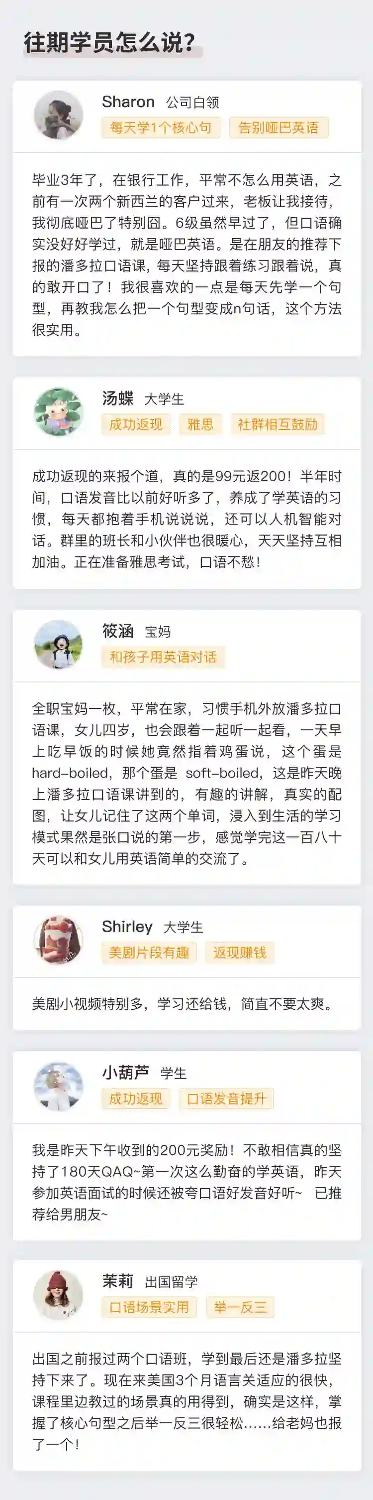总结一下:情景记忆法+180个百搭核心句型(涵盖95%的日常生活、工作场景)+“AI+智慧学习”模式+贴心社群班长监督服务+【学费+奖学金】200元返现!