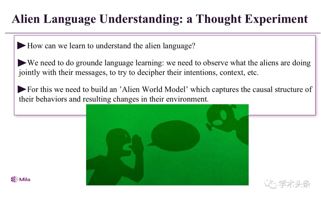 我们需要进行地面语言学习:我们需要观察外星人与他们的信息共同做些什么,试图破译他们的意图,背景等。为此,我们需要建立一个“外星世界模型”,它可以捕捉到他们行为的因果结构,从而改变他们的环境。