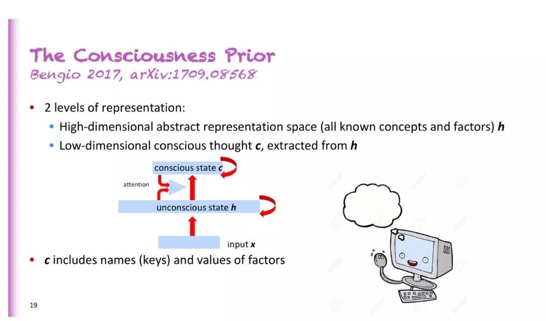 他于2017年发表的论文《The Consciousness Prior》,里面提到与完整的状态相比,有意识的思想是非常低维度的对象,无意识的大脑=类似于基于规则的系统中的句子或规则,但它们具有意想不到的预测价值或有用性。
