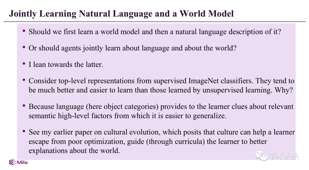 教授问道我们应该先学习一个世界模型,然后再学习它的自然语言描述?还是AI应该共同学习语言和世界?并表示自己更倾向于后者。他说考虑受监督的ImageNet分类器的顶级表示,与无监督学习所学到的相比,它们往往更好,更容易学习。为什么?因为语言(此处为对象类别)为学习者提供了相关语义高级因素的线索,从中可以更容易地进行概括。你无法单纯从大量的语言文本本身来理解它,必须同时学习world model和语言。