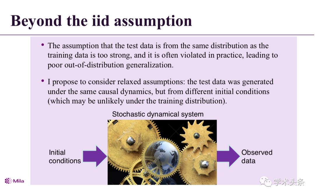 教授还提到了关于iid假设的弱化,即假设测试数据来自与训练数据相同的分布太强,并且在实践中经常被违反,导致分布不均匀的泛化。并表示建议考虑宽松的假设:测试数据是在相同的因果动力学下生成的,但是来自不同的初始条件,通常不太可能服从同样的训练分布。