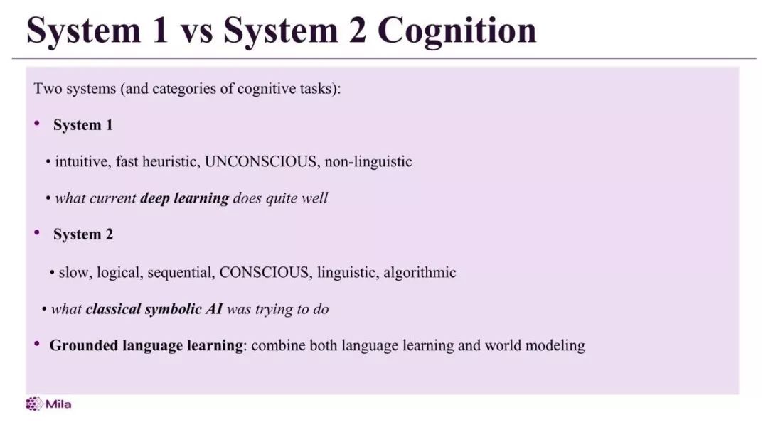 系统1:直观、快速的启发式,无意识的、非语言的,当前的深度学习能够做得很好。