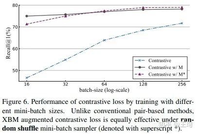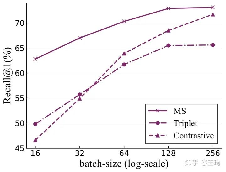 我们在三个标准图像检索数据库上,对于三种标准的pair-based方法,发现随着mini-batch变大,效果(Recall@1)大幅提升。实验结果如下: