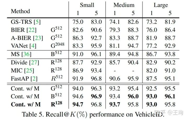 与最近的深度度量学习方法对比,我们在四个较大的检索数据库上,效果均大幅提升,这里仅列出在 VehicleID数据的效果,其他数据集的结果对比参见论文。