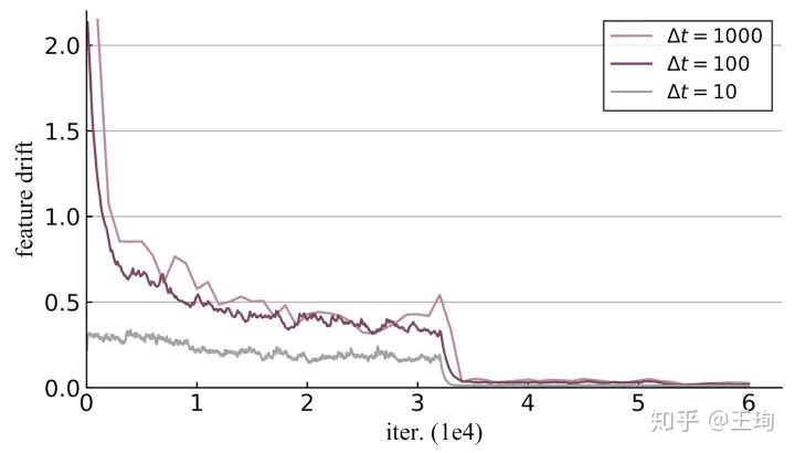 这时候有小朋友就又会问了,过去的mini-batch的特征是由过去的模型提取出来的,而模型在训练过程中是一直更新迭代的,那么过去的样本特征,如果用现在的模型提取,其实是不一样的。但是,不一样并不代表一定不行。关键点是有多不一样,与其猜测,不如去测试看看。我们观察样本特征随着模型训练的偏移量,称之为feature drift(特征偏移),精确定义参见原论文(原论文链接)。