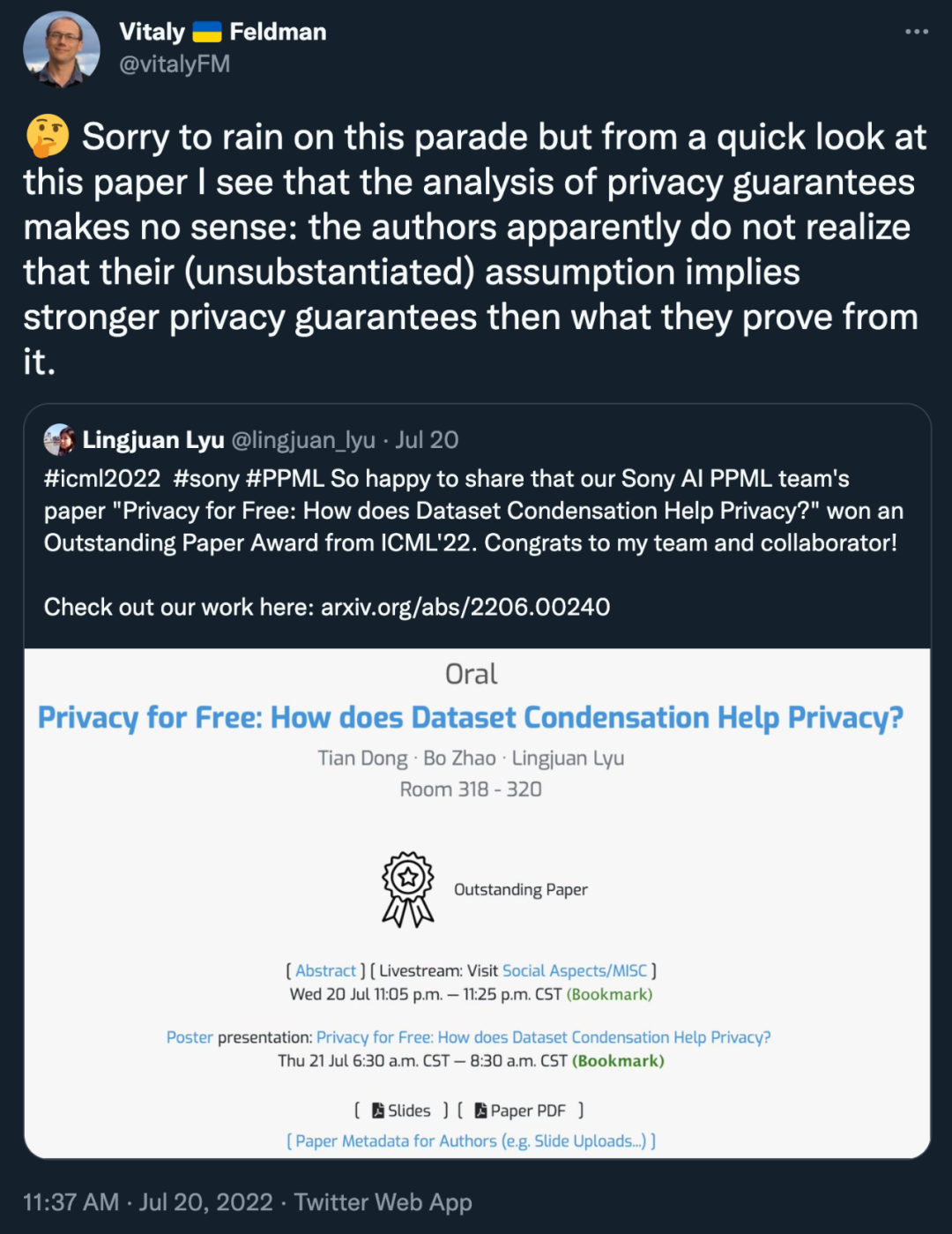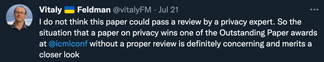 苹果研究科学家 Vitaly Feldman 的说法是:「(这篇论文)对隐私保证的分析毫无意义。作者显然没有意识到他们的(未经证实)的隐私保证的假设比他们所能证明的强大得多。」