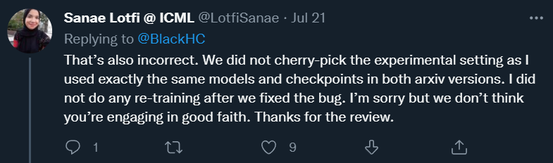 Sanae Lotfi 反驳了 Andreas Kirsch 关于精心挑选实验设置的指控,并表示他们在两个 arXiv 版本中使用了完全相同的模型和检查点,而且在修复 bug 后,他们没有再进行任何的二次训练。