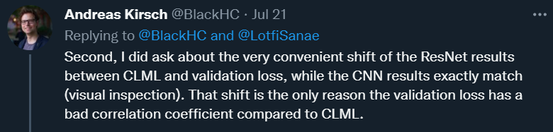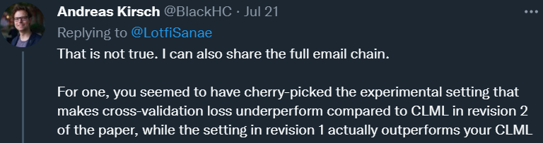 对于这一回复,Andreas Kirsch 并不买账,并接着指出了三点问题。其中一点是,他认为 Sanae Lotfi 组精心挑选了实验配置,使得交叉验证损失的表现低于论文 revision 2 的 CLML,而 revision 1 中的设置实际上优于作者的 CLML。