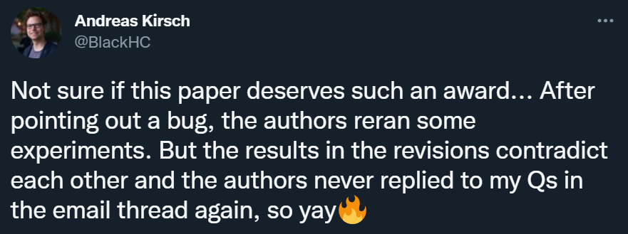 质疑的声音之一来自牛津大学博士生 Andreas Kirsch,他之前曾在谷歌、DeepMind 工作。他表示,在指出了论文的一个 bug 后,作者重新运行了一些实验,但之后得到的结果相互矛盾。