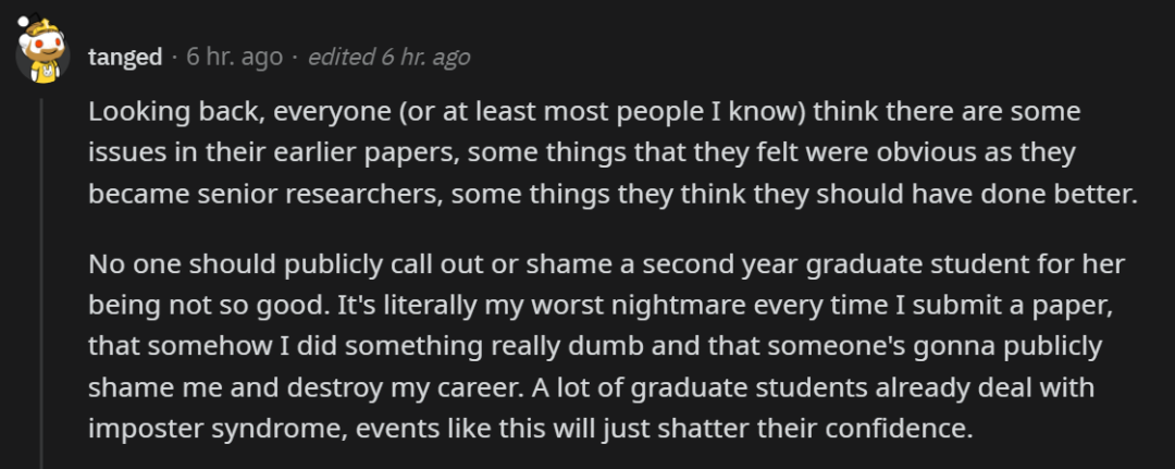 其实,每个成熟的研究者在回顾自己早期的工作时,都会发现一些不完美的地方。如果大家都以这种公开的方式打击他们,他们的自信可能会受到严重影响,甚至患上冒名顶替综合征。