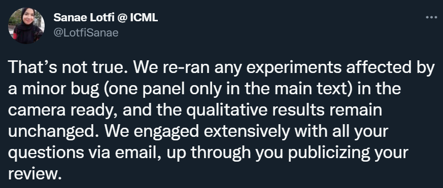不过,这一说法遭到了论文一作 Sanae Lotfi 的反驳,她表示,他们在 camera-ready 版本中重新运行了所有会被那个小 bug 影响的实验,得到的定性结果没变。