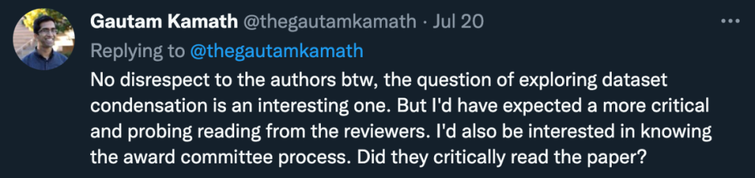 「并非是对作者不尊重,探索数据集浓缩的问题是一个有趣的问题。但我希望审稿人能进行更具批判性和探索性的阅读。我也有兴趣了解奖项委员会的流程。他们是否批判性地阅读了这篇论文?」