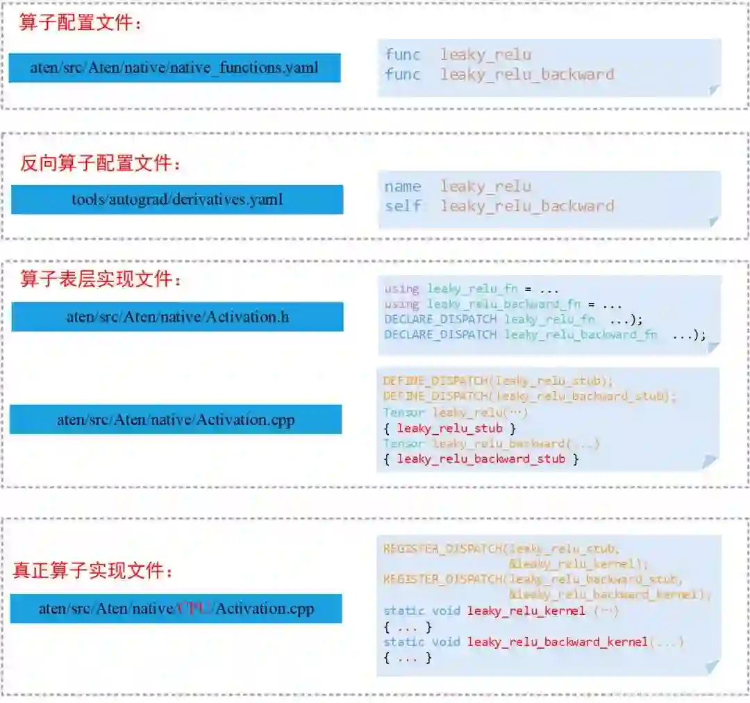 至此,就完成了整个leaky_relu算子的实现流程,总体流程还是比较简单清晰的,并且只需要考虑算子本身的具体实现,而不需要去考虑如何将算子添加到torch模块,添加到torch.nn.functional模块,如何与tensor耦合等业务逻辑。下面这个图更加清晰的展示了这种实现方式(为了节约图片高度,省略cuda的实现)。