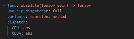 dispatch 字段:表示分发的设备类型对应的op方法。CPU指的是该算子支持CPU设备,对应的实现函数为abs函数,CUDA指的是当前算子支持GPU设备,对应的实现函数为cuda的abs函数。