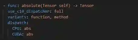 pytorch的原生算子很多都是使用这种方式组织的。在native_functions.yaml中有关于各个算子的说明,然后在同级目录下面有这些算子的实现。使用该方式添加新的算子,主要用在已经支持的硬件上面。例如pytorch本身已经支持了CPU和GPU,此时需要一些新的算子,该算子只需要在CPU或者GPU上面运行,那么这种方式就非常适合。只需要定义新算子的kernel实现,然后添加配置信息,就可以自动生成:torch.xxx()、torch.nn.functional.xxx()以及tensor.xxx()方法,而不用去关注算子与pytorch是如何衔接,以及如何把算子添加到tensor的属性中等其他细节。native_functions.yaml文件位于pytorch源码的pytorch/aten/src/Aten/native/native_functions.yaml,内容如下(截取absolute算子的配置信息),对于每个算子的描述,包括几个主要字段:func、variants、dispatch等。