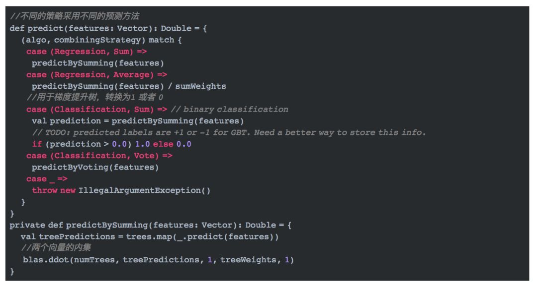 利用梯度提升树进行预测时,调用的predict方法扩展自TreeEnsembleModel,它是树结构组合模型的表示,其核心代码如下所示: