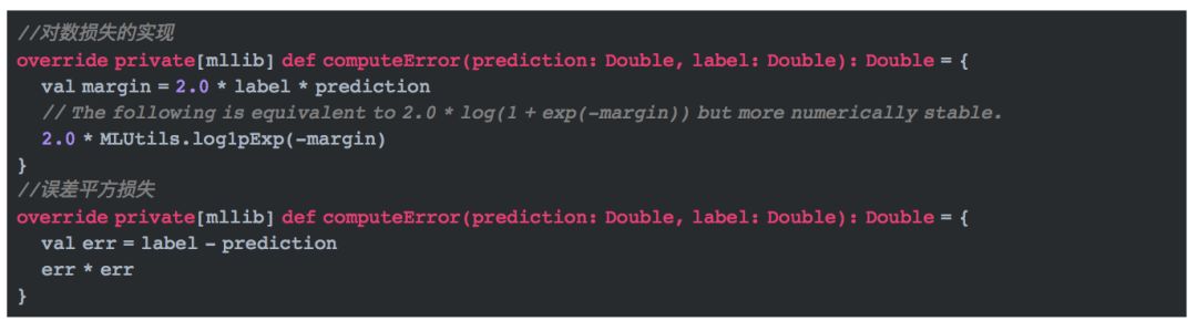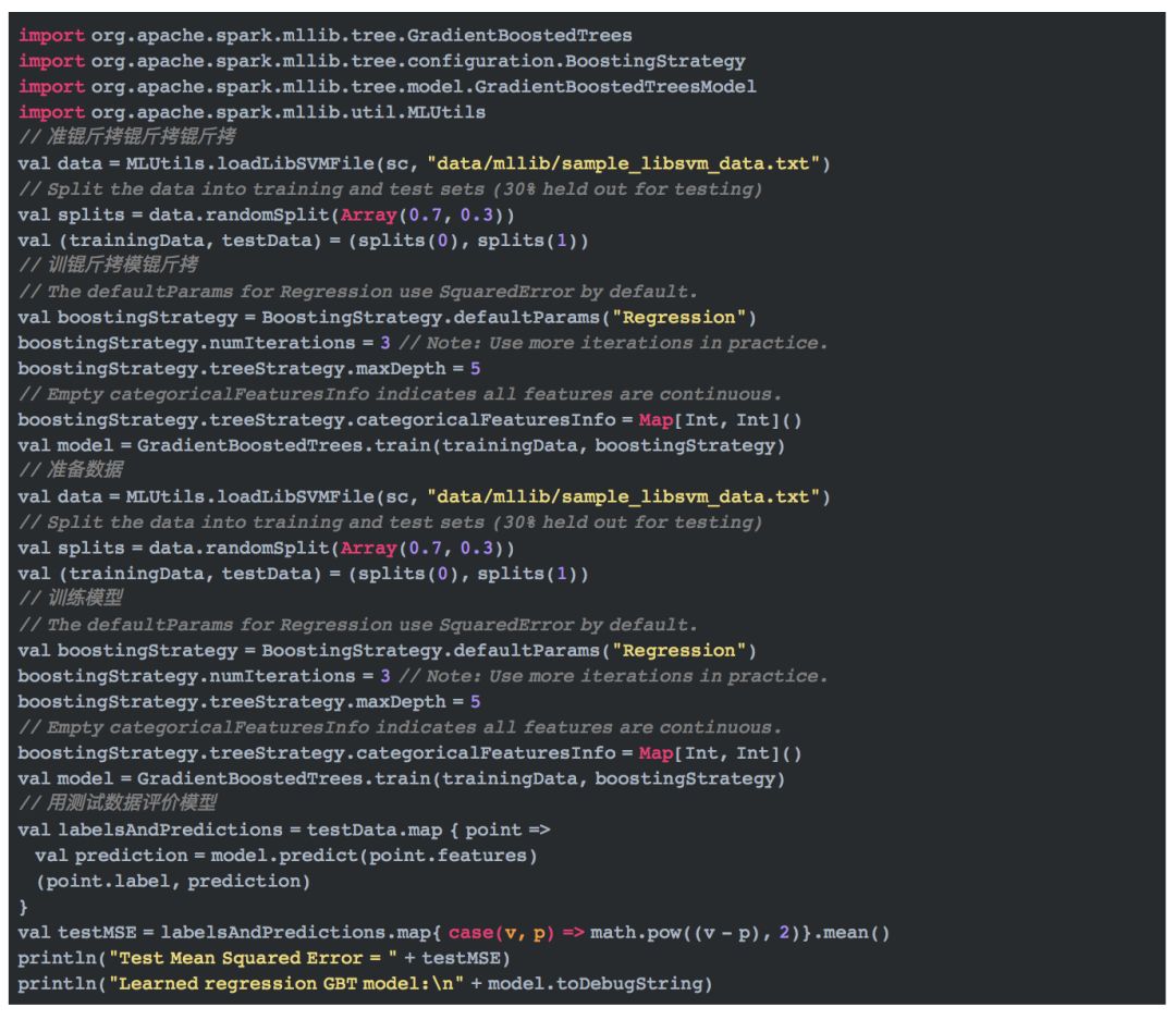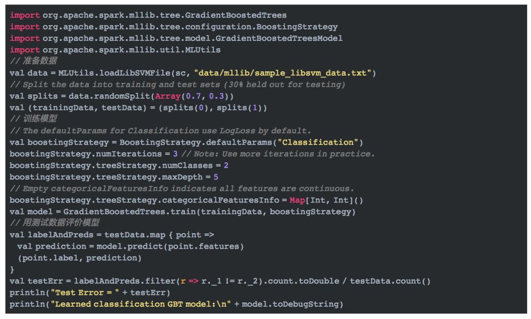 上面代码最重要的部分是更新预测和误差的实现。通过GradientBoostedTreesModel.updatePredictionError实现。