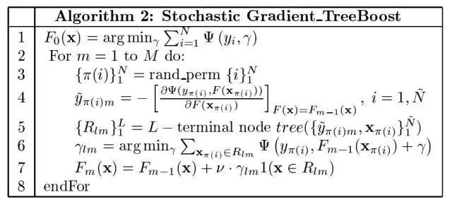 有文献证明,注入随机性到上述的过程中可以提高函数估计的性能。受到Breiman的影响,将随机性作为一个考虑的因素。在每次迭代中,随机的在训练集中抽取一个子样本集,然后在后续的操作中用这个子样本集代替全体样本。 这就形成了随机梯度提升算法。它的流程如下所示: