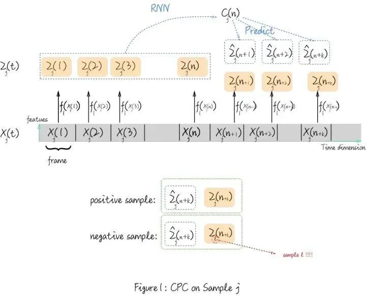 跳出电视剧来说,CPC会在样本里随机选一个时间点 ,把 前面提取到的所有的 用一个回归模型来总结前面所有信息(比如用 RNN得到图里的 ) ,然后用线性变换去预测出 。