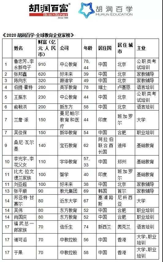 据“胡润百富”微信公众号消息,3月26日,胡润研究院联合国际教育平台胡润百学发布《2020胡润百学·全球教育企业家榜》。根据榜单,中国教育企业家占比超过6成,英国和美国没有教育企业家上榜。