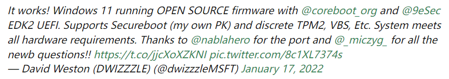微软操作系统安全总监、开发人员 David Weston 在 Twitter 上说,他尝试在完全免费的固件上启动了当前的 Windows 11,其基础是固件组件 Coreboot(旨在用轻量级固件替换大多数计算机中的专有固件)以及作为所谓的有效负载的 UEFI 。目前在圣诞假期间该尝试已经获得成功,Weston 对 Coreboot 项目赞不绝口。但与许多其他系统不同,Windows 11 并不直接用 Coreboot 启动。